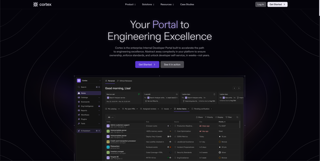 Cortex(https://www.cortex.io)是一个内部开发者门户(IDP),旨在提高整个开发工作流程的可视性、治理和安全性,使开发、安全和运维团队保持一致,以确保合规性并提高系统弹性。