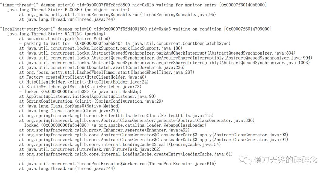 发现在这个地方某些情况会对class_loader加锁。嗯?这里的class loader是什么呢?正是WebappClassLoader,而在之前我好像在哪里看到了某个线程里对WebappClassLoader已经加锁了。回头看文章开头的第一个图,会发现调用HashWheelTimer.start()方法的线程在之前已经获得了WebappClassLoader的锁了。