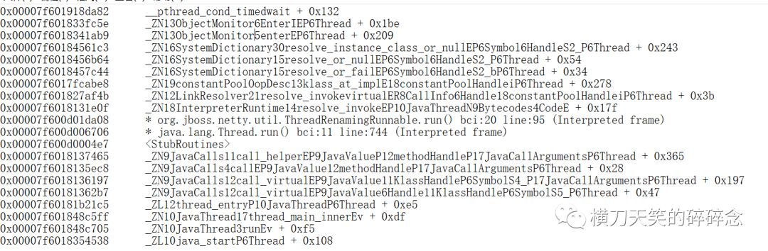 幸运的是现场还在,然后去机器上给jstack加m参数,又抓了一次(加m参数不仅会打印出java栈,还会打印native frame)。