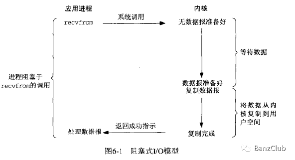 当进程发起一个系统调用时,到返回处理数据结果过程中,进程阻塞于这个系统调用的函数,如:调用系统的接收函数(recvfrom),从设备准备数据到系统缓冲区,到数据从内核拷贝到进程用户空间过程,进程都处于阻塞状态。