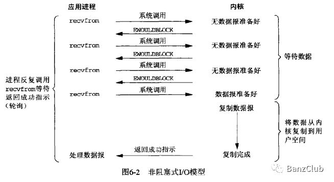非阻塞I/O与阻塞I/O不同的是,进程不会在内核准备数据过程中阻塞,而是如果内核没有准备好数据时,直接返回EWOULDBLOCK错误,然后进程一直轮询访问内核,直到内核准备好数据。