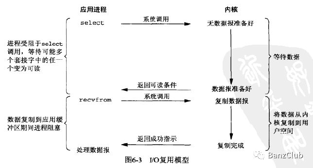 I/O复用阻塞于select调用,等待数据报套接字变成可读,当select返回套接字可读这一条件时,我们再调用recvfrom函数,将数据从内核复制到进程缓冲区。