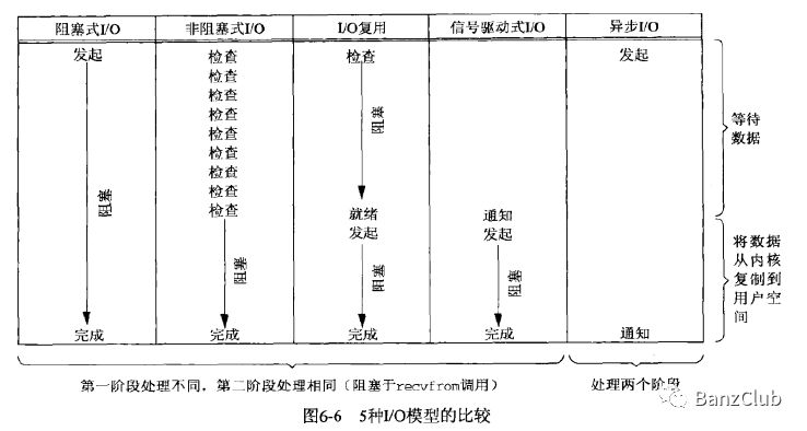 操作系统对于这些I/O操作有几种特定的处理方式,也就是I/O模型,包括阻塞式I/O、非阻塞式I/O、I/O复用、信号驱动式I/O、异步I/O。