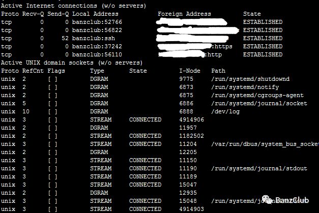 从整体上看,netstat的输出结果可以分为两个部分:一个是Active Internet connections,称为有源TCP连接,其中"Recv-Q"和"Send-Q"指的是接收队列和发送队列。这些数字一般都应该是0。如果不是则表示软件包正在队列中堆积。这种情况只能在非常少的情况见到;另一个是Active UNIX domain sockets,称为有源Unix域套接口(和网络套接字一样,但是只能用于本机通信,性能可以提高一倍)。Proto显示连接使用的协议;RefCnt表示连接到本套接口上的进程号;Types显示套接口的类型;State显示套接口当前的状态;Path表示连接到套接口的其它进程使用的路径名-a或--all:显示所有连线中的Socket;-A<网络类型>或--<网络类型>:列出该网络类型连线中的相关地址;-c或--continuous:持续列出网络状态;-C或--cache:显示路由器配置的快取信息;-e或--extend:显示网络其他相关信息;-F或--fib:显示FIB;-g或--groups:显示多重广播功能群组组员名单;-h或--help:在线帮助;-i或--interfaces:显示网络界面信息表单;-l或--listening:显示监控中的服务器的Socket;-M或--masquerade:显示伪装的网络连线;-n或--numeric:直接使用ip地址,而不通过域名服务器;-N或--netlink或--symbolic:显示网络硬件外围设备的符号连接名称;-o或--timers:显示计时器;-p或--programs:显示正在使用Socket的程序识别码和程序名称;-r或--route:显示Routing Table;-s或--statistice:显示网络工作信息统计表;-t或--tcp:显示TCP传输协议的连线状况;-u或--udp:显示UDP传输协议的连线状况;-v或--verbose:显示指令执行过程;-V或--version:显示版本信息;-w或--raw:显示RAW传输协议的连线状况;-x或--unix:此参数的效果和指定"-A unix"参数相同;--ip或--inet:此参数的效果和指定"-A inet"参数相同。