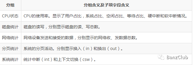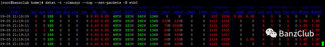 -c:显示CPU系统占用,用户占用,空闲,等待,中断,软件中断等信息。-C:当有多个CPU时候,此参数可按需分别显示cpu状态,例:-C 0,1 是显示cpu0和cpu1的信息。-d:显示磁盘读写数据大小。-D hda,total:include hda and total。-n:显示网络状态。-N eth1,total:有多块网卡时,指定要显示的网卡。-l:显示系统负载情况。-m:显示内存使用情况。-g:显示页面使用情况。-p:显示进程状态。-s:显示交换分区使用情况。-S:类似D/N。-r:I/O请求情况。-y:系统状态。--ipc:显示ipc消息队列,信号等信息。--socket:用来显示tcp udp端口状态。-a:此为默认选项,等同于-cdngy。-v:等同于 -pmgdsc -D total。--output 文件:此选项也比较有用,可以把状态信息以csv的格式重定向到指定的文件中,以便日后查看。例:dstat --output /root/dstat.csv & 此时让程序默默的在后台运行并把结果输出到/root/dstat.csv文件中。