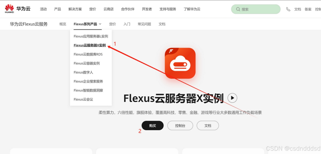 在华为云官网首页,可以在精选推荐模块中找到 Flexus 云服务器 X 实例,点击进入 Flexus 云服务器 X 实例主页。然后,点击页面中的“购买”选项,进入 Flexus 云服务器 X 实例购买页面。