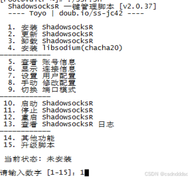 备用脚本安装 SSR:(如果此时链接断了,重连后输入./ssr.sh 就可以进入下面安装操作,以后修改时也输入./ssr.sh)