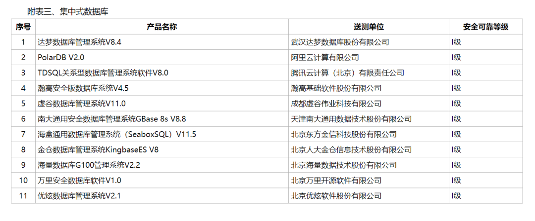 2023年12月26日,中国信息安全测评中心、国家保密科技测评中心发布的《安全可靠测评结果公告(2023年第1号)》,包含了9款集中式数据库,标志着国产数据库进入规范发展阶段。通过权威测评和认证,提升了产品质量和安全性,增强了用户信任度,促使企业注重标准化和规范化建设,推动行业健康有序发展。