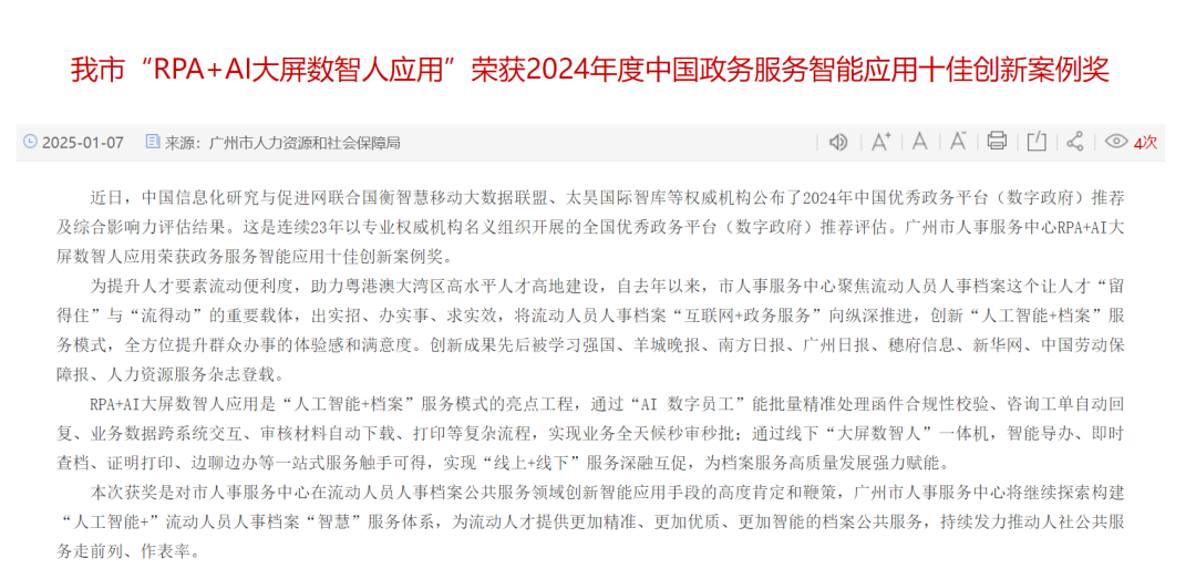 AI优化信创产品性能:近日,中国信息化研究与促进网联合国衡智慧移动大数据联盟、太昊国际智库等权威机构公布了2024年中国优秀政务平台(数字政府)推荐及综合影响力评估结果。这是连续23年以专业权威机构名义组织开展的全国优秀政务平台(数字政府)推荐评估。广州市人事服务中心RPA+AI大屏数智人应用荣获政务服务智能应用十佳创新案例奖。