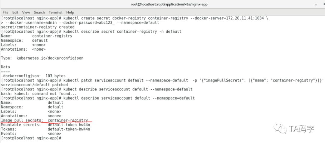 kubectl create secret docker-registry container-registry --docker-server=172.20.11.41:1034 \--docker-username=admin --docker-password=abc123_ --namespace=defaultkubectl describe secret container-registry -n defaultkubectl patch serviceaccount default --namespace=default -p '{"imagePullSecrets": [{"name": "container-registry"}]}'