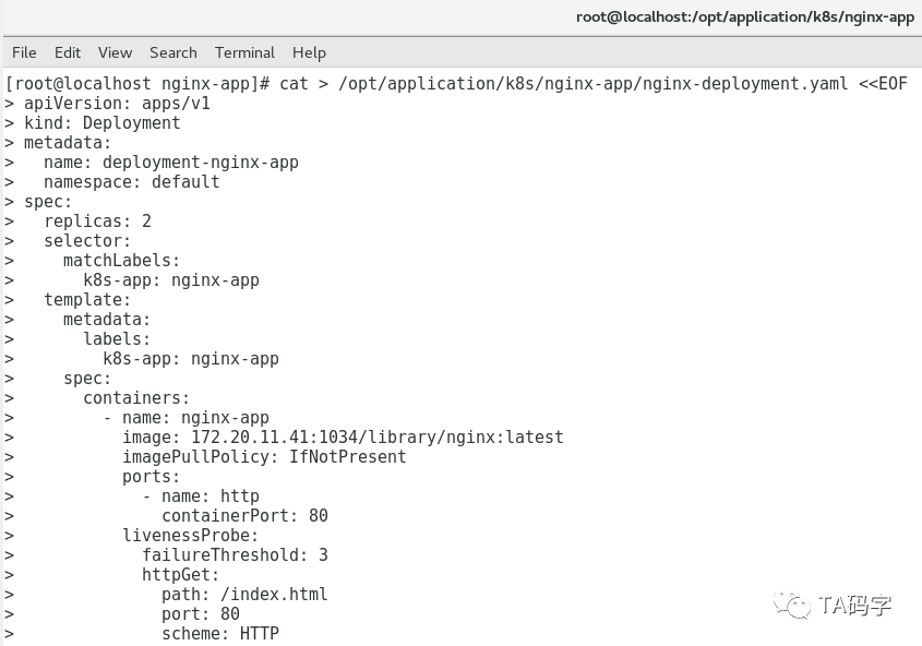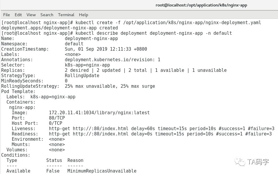cat > /opt/application/k8s/nginx-app/nginx-deployment.yaml <<EOFapiVersion: apps/v1kind: Deploymentmetadata:name: deployment-nginx-appnamespace: defaultspec:replicas: 2selector:matchLabels:k8s-app: nginx-apptemplate:metadata:labels:k8s-app: nginx-appspec:containers:- name: nginx-appimage: 172.20.11.41:1034/library/nginx:latestimagePullPolicy: IfNotPresentports:- name: httpcontainerPort: 80livenessProbe:failureThreshold: 3httpGet:path: /index.htmlport: 80scheme: HTTPinitialDelaySeconds: 60periodSeconds: 10successThreshold: 1timeoutSeconds: 15readinessProbe:failureThreshold: 3httpGet:path: /index.htmlport: 80scheme: HTTPperiodSeconds: 10successThreshold: 1timeoutSeconds: 15EOFkubectl create -f /opt/application/k8s/nginx-app/nginx-deployment.yamlkubectl describe deployment deployment-nginx-app -n default