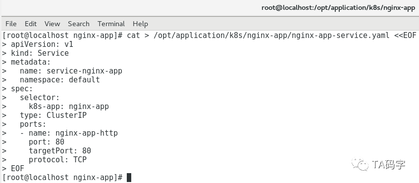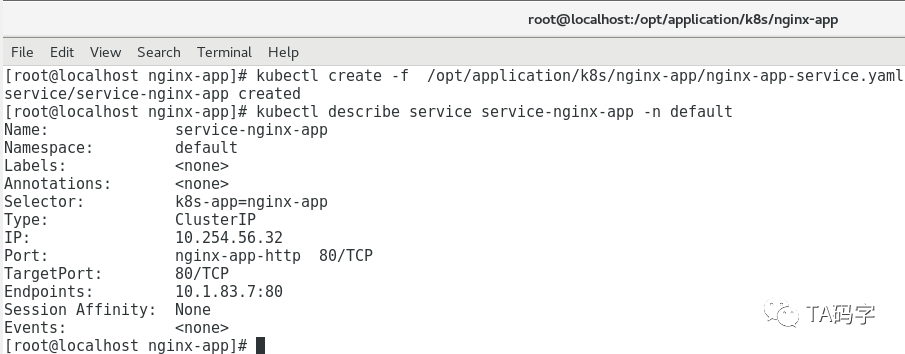 cat > /opt/application/k8s/nginx-app/nginx-app-service.yaml <<EOFapiVersion: v1kind: Servicemetadata:name: service-nginx-appnamespace: defaultspec:selector:k8s-app: nginx-apptype: ClusterIPports:- name: nginx-app-httpport: 80targetPort: 80protocol: TCPEOFkubectl create -f /opt/application/k8s/nginx-app/nginx-app-service.yamlkubectl describe service service-nginx-app -n default