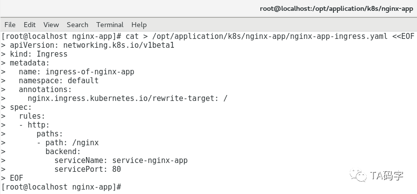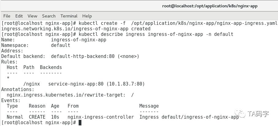cat > /opt/application/k8s/nginx-app/nginx-app-ingress.yaml <<EOFapiVersion: networking.k8s.io/v1beta1kind: Ingressmetadata:name: ingress-of-nginx-appnamespace: defaultannotations:nginx.ingress.kubernetes.io/rewrite-target: /spec:rules:- http:paths:- path: /nginxbackend:serviceName: service-nginx-appservicePort: 80EOFkubectl create -f /opt/application/k8s/nginx-app/nginx-app-ingress.yamlkubectl describe ingress ingress-of-nginx-app -n default