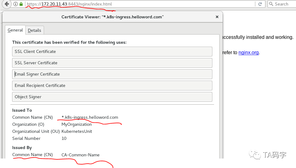 这里我们在创建nginx-ingress-controller的时候,这个nginx-ingress-controller会默认有http到https的跳转,所以虽然我们在container里面没有声明https,我们依然可以访问到。另外在证书详情里我们也可以看到这个证书就是我们以前文章中给nginx-ingress-controller配置的默认ssl证书。