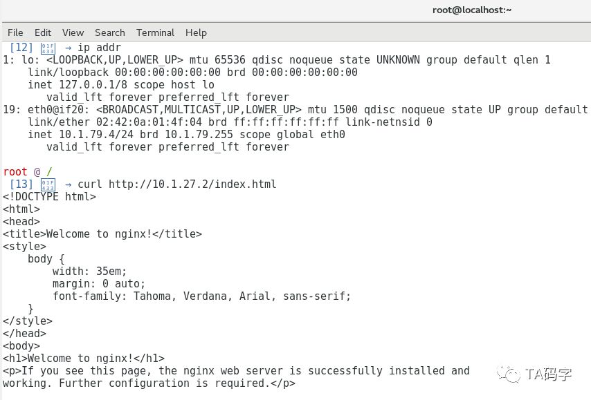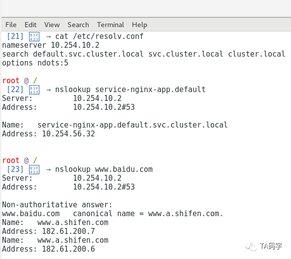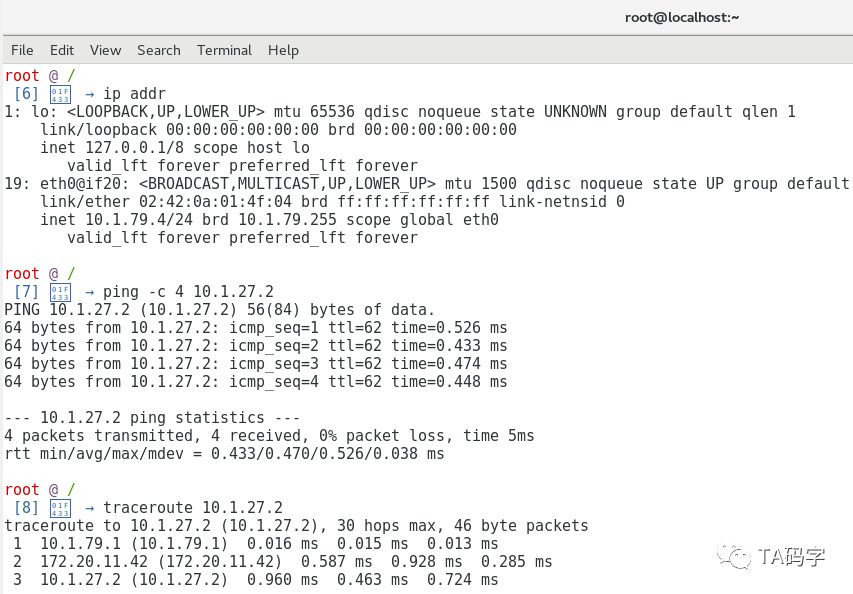 这里我们debug进入10.1.79.4(在node 172.20.11.43上)中,分别用ping去ping 10.1.27.2(在node 172.20.11.42上)。用curl访问10.1.27.2(在node 172.20.11.42上)的nginx application,用tracroute去跟踪10.1.27.2(在node 172.20.11.42上),用nslookup去查询内部service的fqdn和外部域名的fqdn。