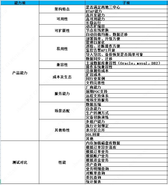 功能性指标:可用性(高并发、高可用、长稳运行)、易用性(部署升级、管理运维、可监测性)、可扩展性(水平扩展、垂直扩展)、兼容性(硬件及操作系统、应用和开发工具、主流数据库兼容(包括数据类型、存储过程、触发器等))、成本和生态(总体成本、同行业案例、数据库生态和技术支持能力);