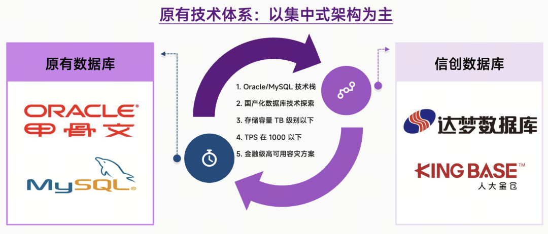 在 2018 年以前,华安基金的数据库技术栈采用了集中式架构,以 Oracle 为主,MySQL 为辅;在 2018 年后,系统的数据量和并发量都有了大规模的增长,数据仓库层面引入了一套基于 Hadoop 生态的国产化分布式数据库;到 2023 年华安基金响应号召进行了国产化改造,进行了国产集中式数据库的选型替换。随着业务的不断发展,面对系统的复杂性,一个既能处理大量事务,又能进行实时分析的数据库解决方案成为了必须,因此,华安基金开启了新一轮的架构选型。