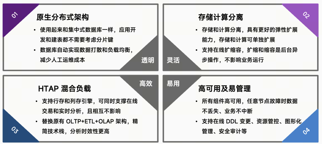 HTAP 混合负载:TiDB 支持行存储和列存储引擎,能够同时支持在线交易和实时分析,两种操作互不干扰。这种混合负载能力简化了技术栈,提高了分析效率,替代了原有的 OLTP+ETL+OLAP 架构。