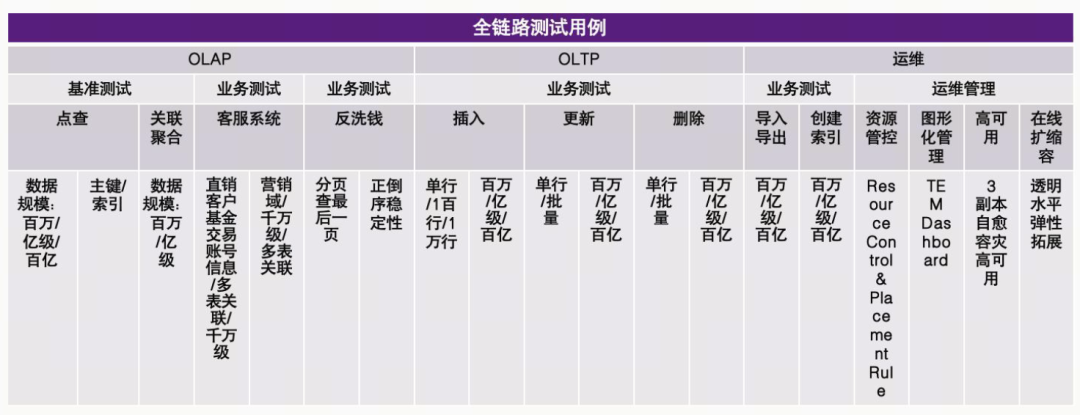 根据以上原则,本轮选型测试采用 3 节点国产化硬件服务器以及操作系统进行部署,对百万级/亿级别/百亿级别等 13 项 HTAP 场景进行了业务测试,测试的场景和标准如下: