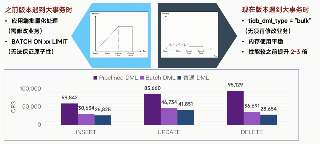 过去,在处理大规模事务的过程中,往往需要调整应用端的业务逻辑和需求以适应大量数据的导入,使用到批处理 DML(Batch DML)功能。随着 TiDB pipelined DML 功能的推出,现在可以通过简单地添加一个参数开关来提升性能,无需再对业务操作进行修改。这一改进显著简化了操作流程,提高了效率。