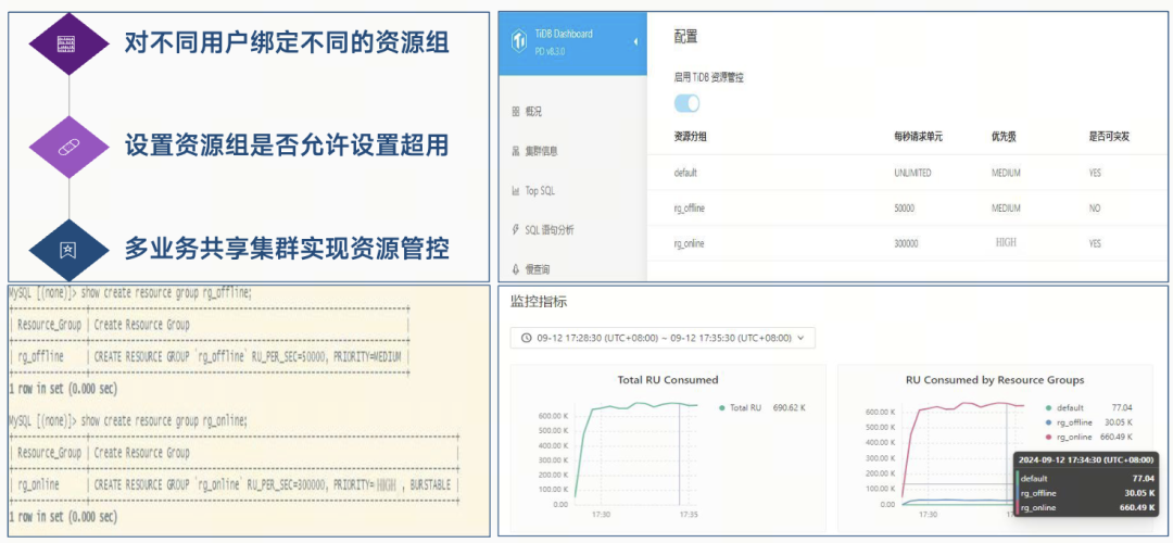 TiDB 的资源管控特性为系统提供了关键的资源分配能力。报表系统需要特定的资源分配策略,尤其是确保高层管理部门能够优先获取计算资源。对于后台部门,如执行常规数据处理的,对速度的要求相对宽松。为此,华安基金实施了两个资源池的设置:一个是高优先级的 online(在线)资源池,另一个是 offline(离线)资源池。在系统界面中(RU Consumed by Resource Groups),online 资源池以红色标识,而 offline 资源池以蓝色显示,确保 online 资源池能够获得更高的优先级和使用权限。