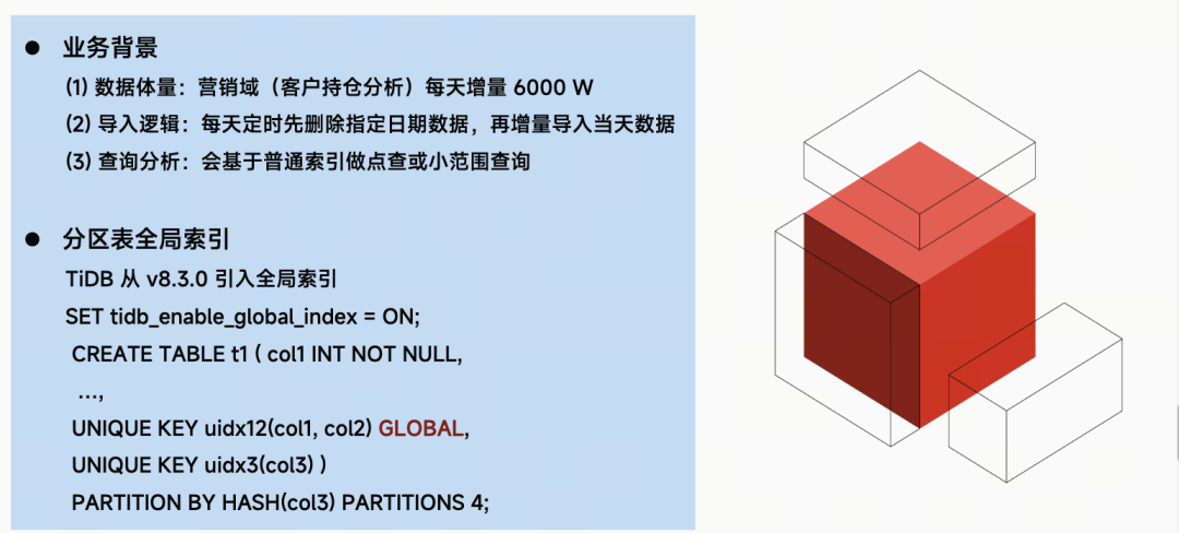 TiDB 的新特性——分区表全局索引,在营销领域的客户持仓分析中发挥了重要作用。面对一张每天新增超过 6000 万条持仓数据的明细表,数据导入过程中的稳定性非常重要,需要开启特定开关来确保操作的安全性。此外,针对业务人员的查询需求,通常基于普通索引执行点查询或小范围查询,TiDB 提供的全局索引(Global Index)功能显著提升了使用的高效性和便捷性。