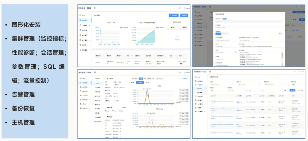 TiDB 的图形化管控界面简化了操作流程,避免了仅依赖命令行进行操作的复杂性,同时集成了告警管理、数据备份和主机管理等关键功能。这些功能的集成与华安基金现有的大数据仓库操作高度一致,从而提高了管理效率和用户体验。