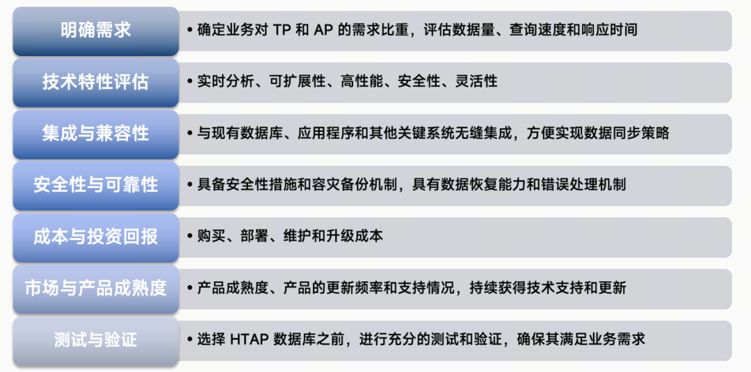 明确需求:首先评估业务对 TP(事务处理)和 AP(分析处理)的需求比重,确定数据量、查询速度和响应时间,确保数据库能满足业务对实时性的要求。