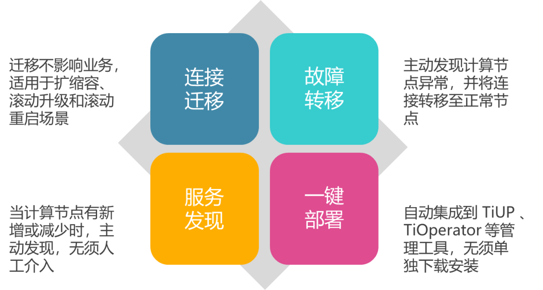 连接迁移。连接迁移就是说可以把客户端连接从 A 计算节点迁移到 B 计算节点而不影响业务。这种通常在扩缩容、滚动升级、滚动重启场景使用,是一种计划内的动作,如果是计算节点异常下线这种情况,则不属于连接迁移的范畴。