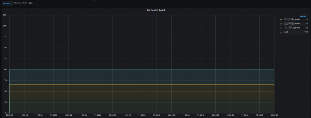 使用 100 并发连接开启 sysbench 压力测试,场景为 oltp_read_only。观察各 tidb server 连接数情况,连接数分别为 33/33/34,处于相对均衡的状态。