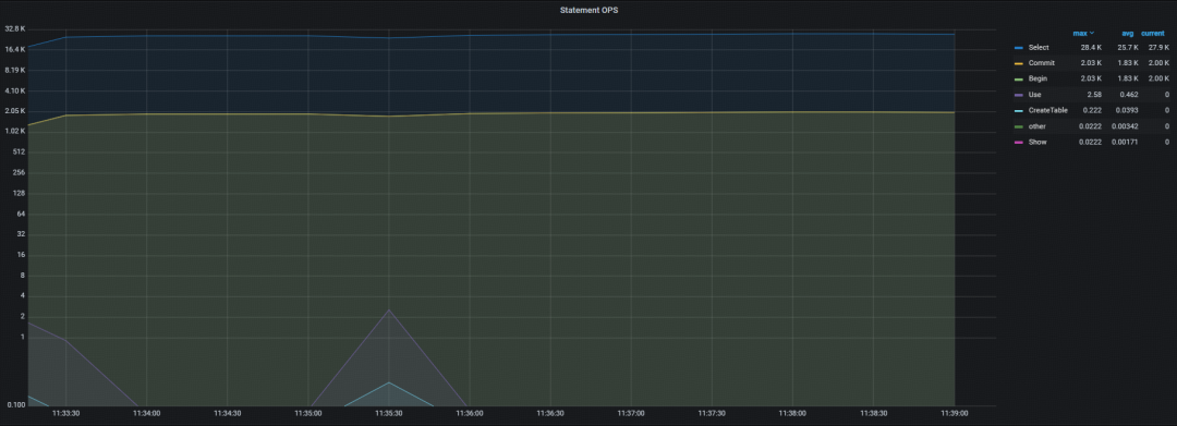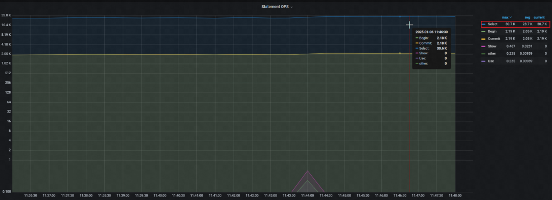 观察扩容过程中 sysbench 压测情况,发现运行平稳无任何报错。通过监控查看运行时 QPS,查询 QPS 约为 30.7 K,较之前 QPS 有上升的趋势。