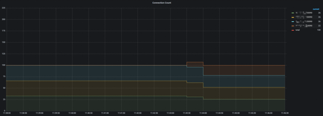 观察各 tidb server 连接数情况,连接数分别为 26/26/26/22,处于相对均衡的状态,可以看到在运行过程中连接被自动迁移到扩容的 tidb server 节点,无须手工介入。