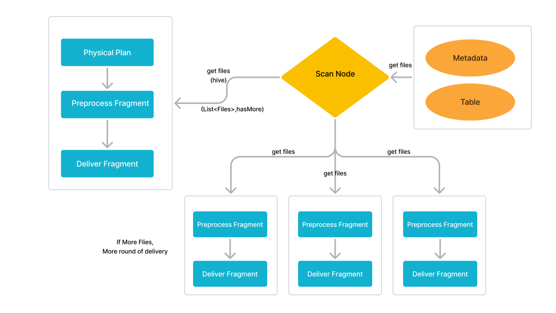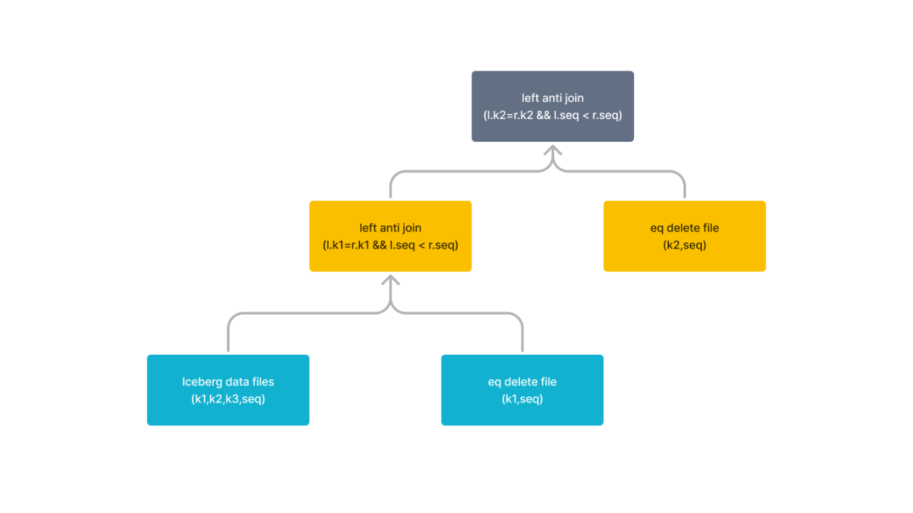 为了优化这一问题,3.4 版本通过单独生成一个 Iceberg eq-delete scan node 的方式改写 Query plan,采用 shuffle 或 broadcast delete file 数据,从而避免重复读取。在 delete file 较多的场景中,查询性能可提升数倍。
