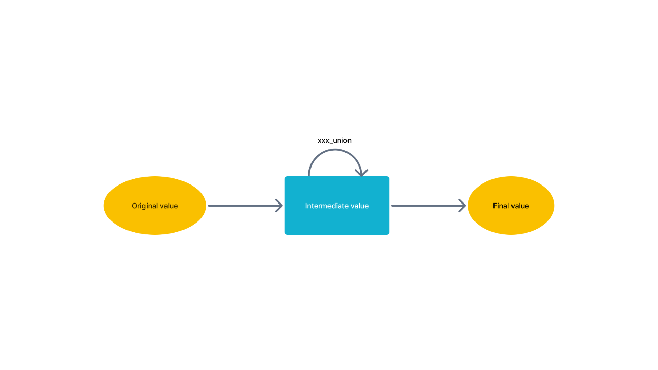 为例,中间态数据是对输入数据 value 分别求 sum 和 count 后的两个值(实际为一个 binary 类型字段),并存储,而不是一个原值 value。INSERT INTO test_create_agg_tableSELECT dt, v, -- directly use v when the aggregate func is SUMavg_state(id), -- use xxx_state() to get the intermediate valuearray_agg_state(id),min_by_state(province, id)FROM t1;对于中间态数据做聚合并继续存储为中间态数据时,需使用