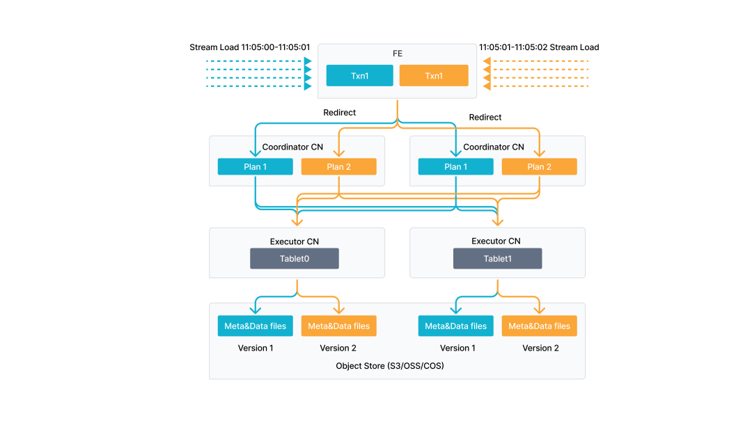FE 会按照作业配置的允许合并时间划分为一个个时间区间,将一个时间区间内的很多小批量导入作业合并提交为一个新的导入作业,再类似于 Broker Load 一样进行数据导入。