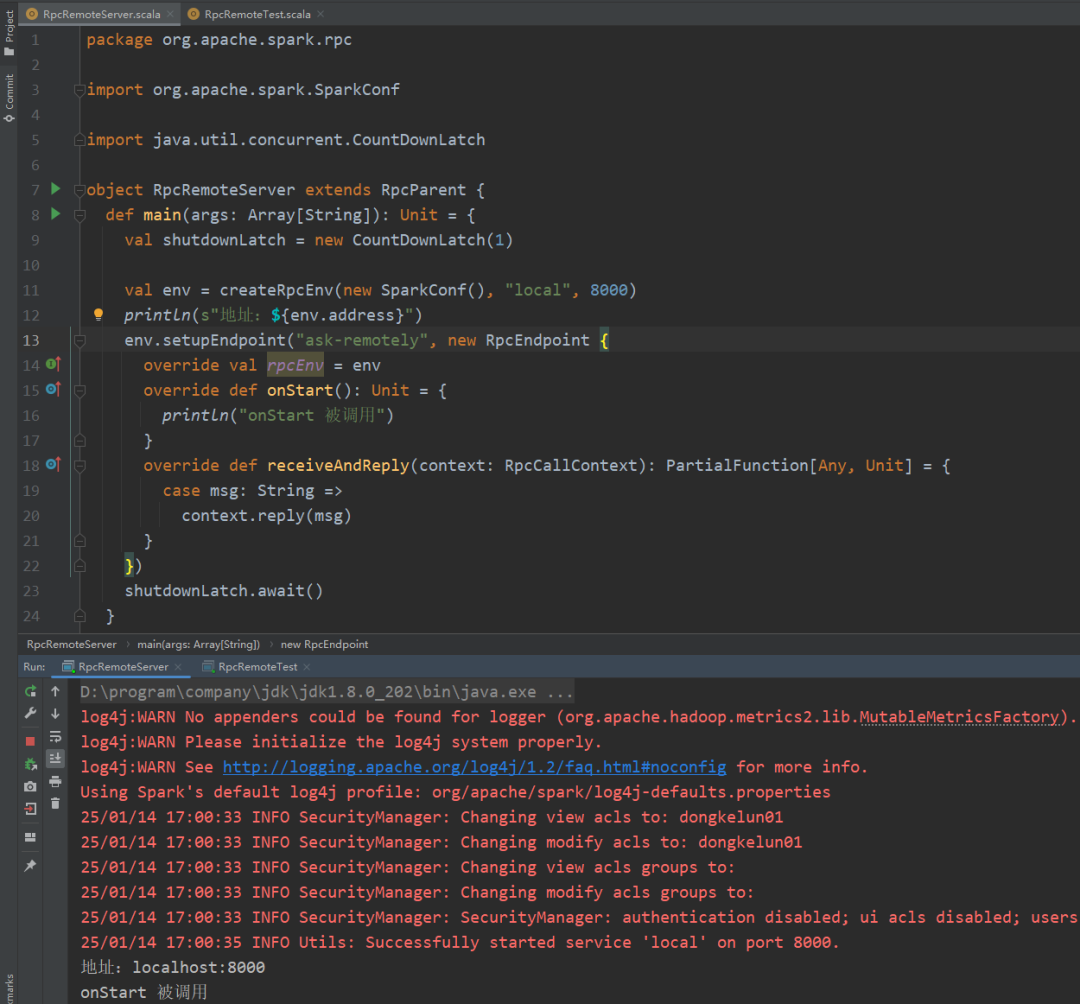package org.apache.spark.rpcimport org.apache.spark.SparkConfimport java.util.concurrent.CountDownLatchobject RpcRemoteServer extends RpcParent {def main(args: Array[String]): Unit = {val shutdownLatch = new CountDownLatch(1)val env = createRpcEnv(new SparkConf(), "local", 8000)println(s"地址:${env.address}")env.setupEndpoint("ask-remotely", new RpcEndpoint {override val rpcEnv = envoverride def onStart(): Unit = {println("onStart 被调用")}override def receiveAndReply(context: RpcCallContext): PartialFunction[Any, Unit] = {case msg: String =>context.reply(msg)}})shutdownLatch.await()}}