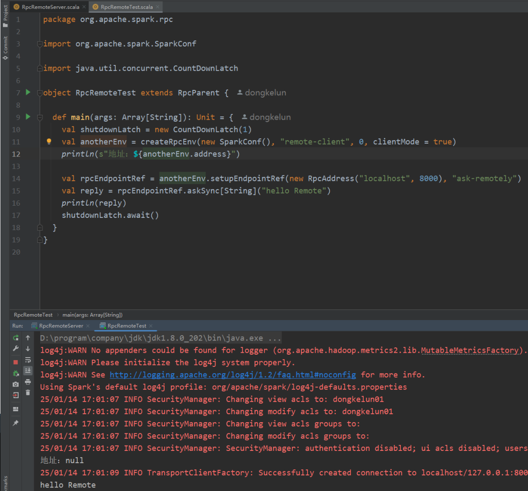 package org.apache.spark.rpcimport org.apache.spark.SparkConfimport java.util.concurrent.CountDownLatchobject RpcRemoteTest extends RpcParent {def main(args: Array[String]): Unit = {val shutdownLatch = new CountDownLatch(1)val anotherEnv = createRpcEnv(new SparkConf(), "remote-client", 0, clientMode = true)println(s"地址:${anotherEnv.address}")val rpcEndpointRef = anotherEnv.setupEndpointRef(new RpcAddress("localhost", 8000), "ask-remotely")val reply = rpcEndpointRef.askSync[String]("hello Remote")println(reply)shutdownLatch.await()}}