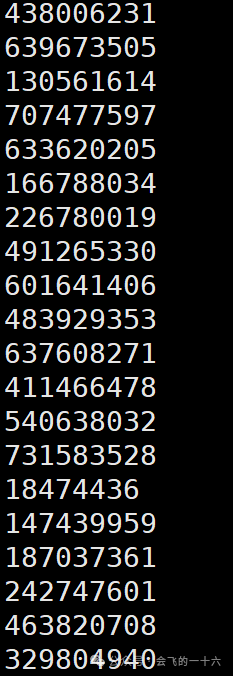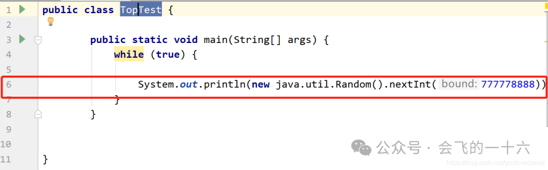 public class TopTest {public static void main(String[] args) {while (true) {System.out.println(new java.util.Random().nextInt(777778888));}}}