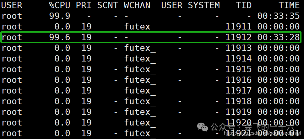 USER %CPU PRI SCNT WCHAN USER SYSTEM TID TIMEroot 99.9 - - - - - - 00:33:35root 0.0 19 - futex_ - - 11911 00:00:00root 99.6 19 - - - - 11912 00:33:28root 0.0 19 - futex_ - - 11913 00:00:00root 0.0 19 - futex_ - - 11914 00:00:00root 0.0 19 - futex_ - - 11915 00:00:00root 0.0 19 - futex_ - - 11916 00:00:00root 0.0 19 - futex_ - - 11917 00:00:00root 0.0 19 - futex_ - - 11918 00:00:00root 0.0 19 - futex_ - - 11919 00:00:00root 0.0 19 - futex_ - - 11920 00:00:00root 0.0 19 - futex_ - - 11921 00:00:01root 0.0 19 - futex_ - - 11922 00:00:00root 0.0 19 - futex_ - - 11923 00:00:00root 0.0 19 - futex_ - - 11924 00:00:00root 0.0 19 - futex_ - - 11925 00:00:00root 0.0 19 - futex_ - - 11926 00:00:00root 0.0 19 - futex_ - - 11927 00:00:00root 0.0 19 - futex_ - - 11928 00:00:00root 0.0 19 - futex_ - - 11929 00:00:00root 0.0 19 - futex_ - - 11930 00:00:00