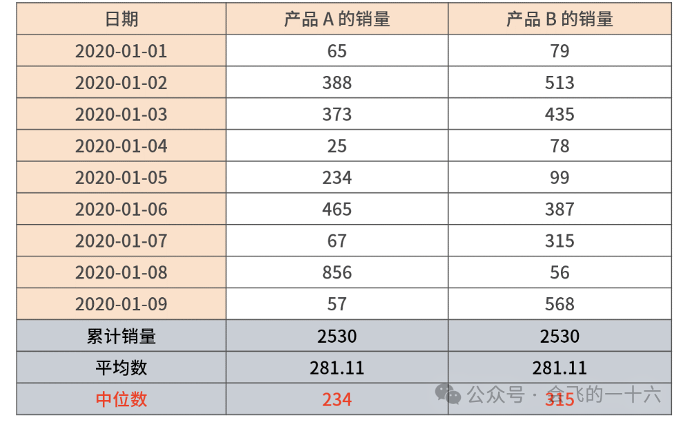 由上表可以看出,产品 A 和产品 B 的累计销售额完全一样,日均销售额也完全一样,仅看这两个指标无法得出任何业务结论;但是我们试着看看产品 A 和产品 B 的平均数和中位数,情况就有趣了。