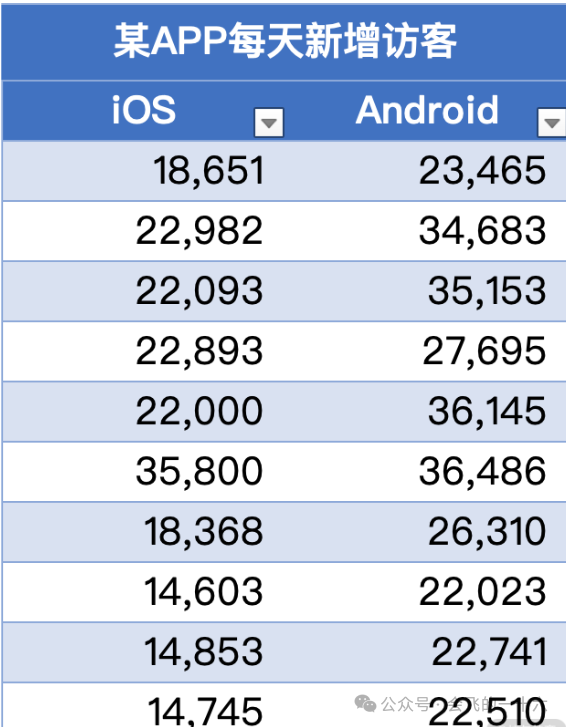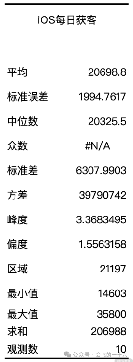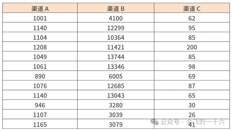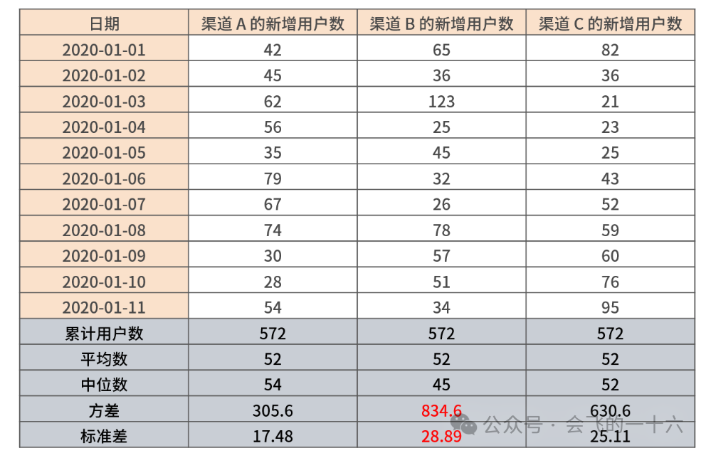 从上表可以看出,仅分析这三个渠道的累计新增用户数、日均新增用户数无法得出任何业务结论,同时分析各个渠道自己的平均值和中位数也难以评估渠道的获客稳定性。
