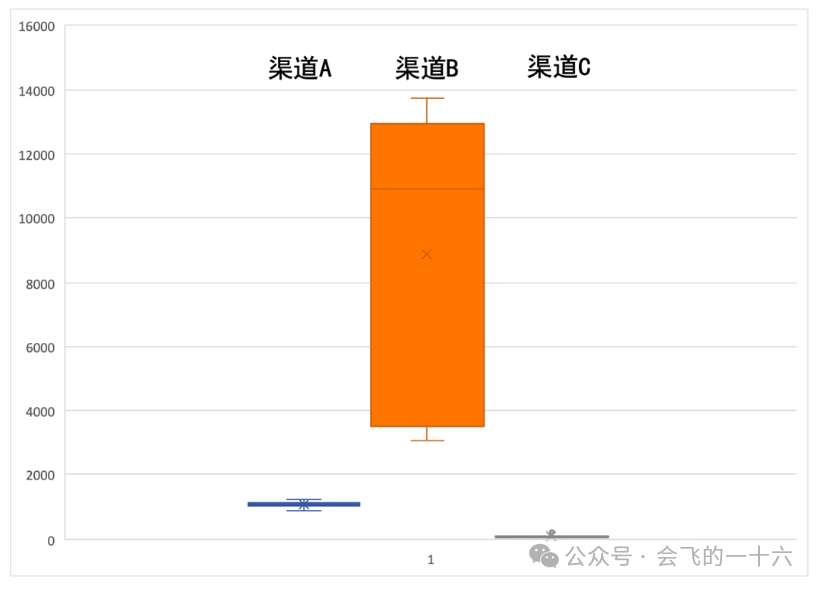 渠道 B 的获客能力排位第一,因为它的箱线图位置最上,同时稳定性也最差,因为箱线图中的箱体高度最高,整体运营正常,并无异常值出现;