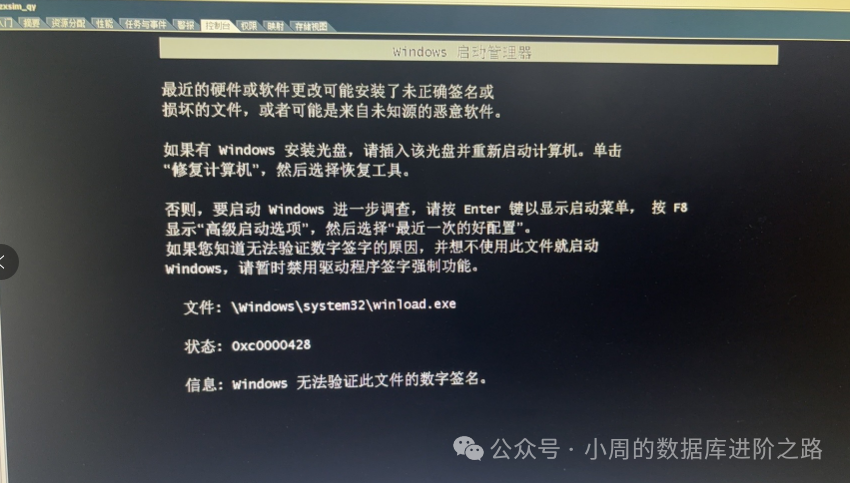 注意:需要把加载的镜像注释掉再进行重启。如果系统没关闭自动更新服务,会有以下页面的报错。bcdedit