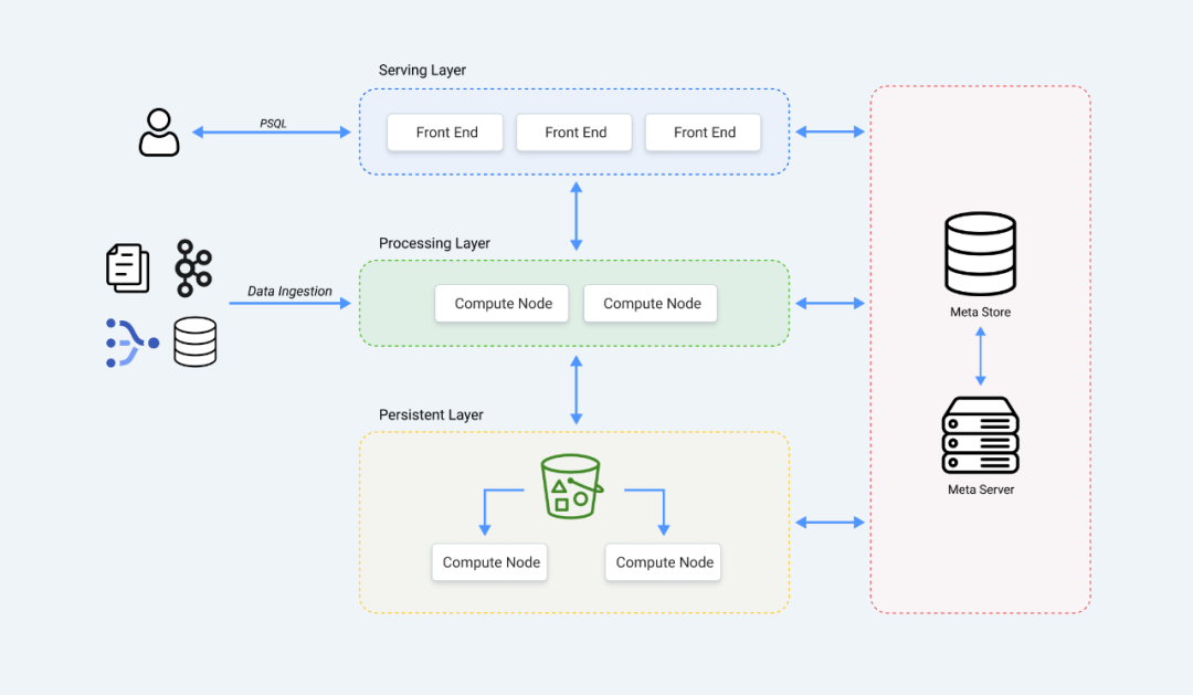 持久化数据存储:这是存储表数据、物化视图以及流处理操作状态的地方。它使用高效的 LSM 树格式 (Log-Structured Merge),并存储在像 AWS S3这样的云对象存储服务中。 元数据存储:这里存储着关于数据和系统本身的所有信息。