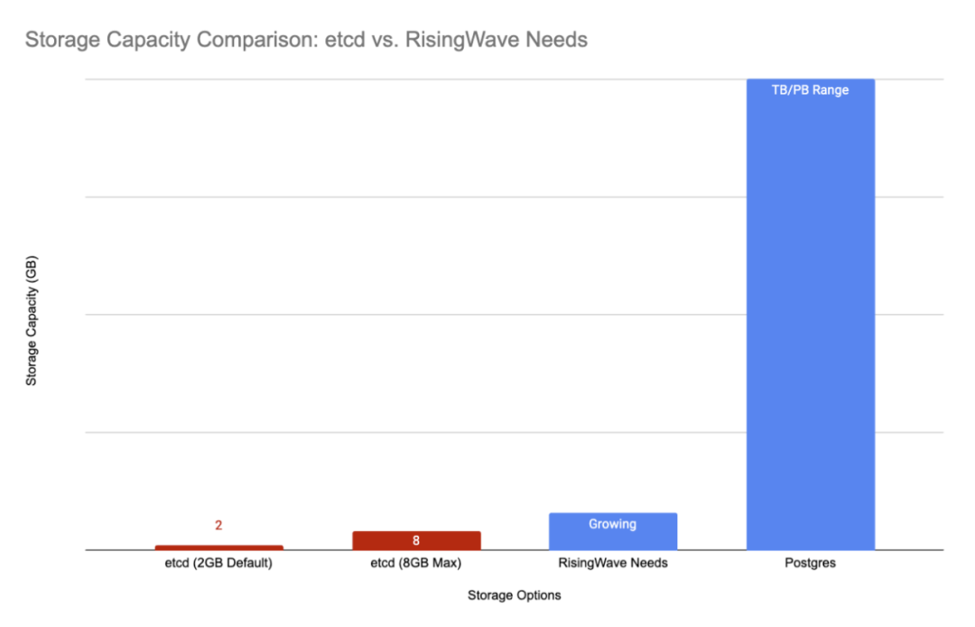 etcd 的架构基于单个 Raft 组,没有 Sharding,这严重影响了其可扩展性。默认存储限制为 2 GB,推荐的最大值为 8 GB。这对我们来说是一个显著制约,因为 RisingWave 集群中的元数据量迅速增长。在某些情况下,磁盘空间不足时,我们甚至经历了部分提交事务导致的数据损坏。使用 Protobuf 编码处理元数据也使得调试和故障排查变得复杂。