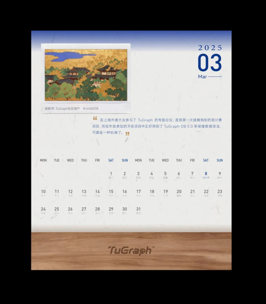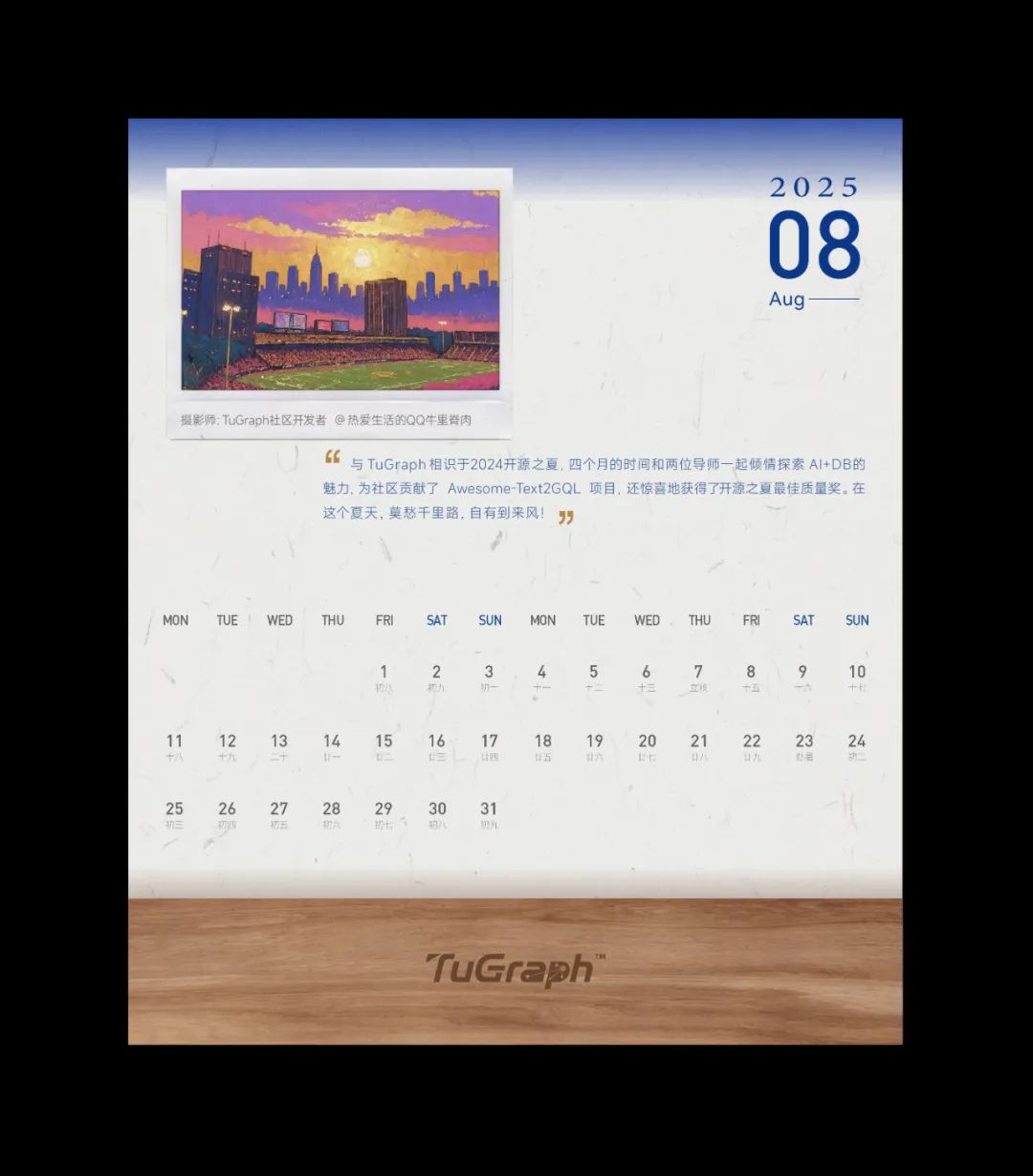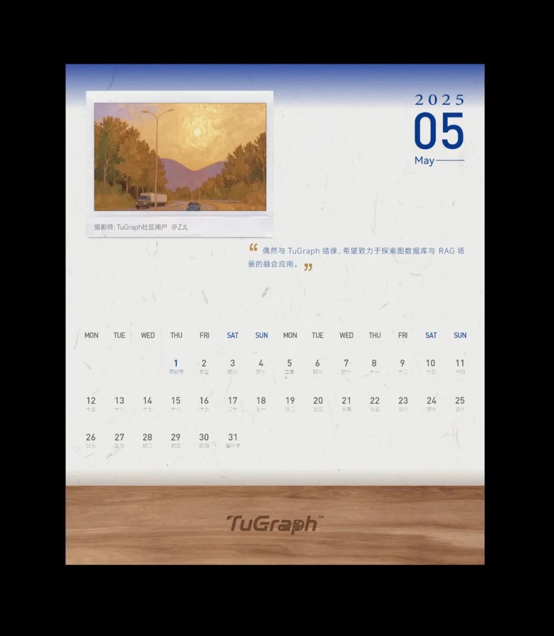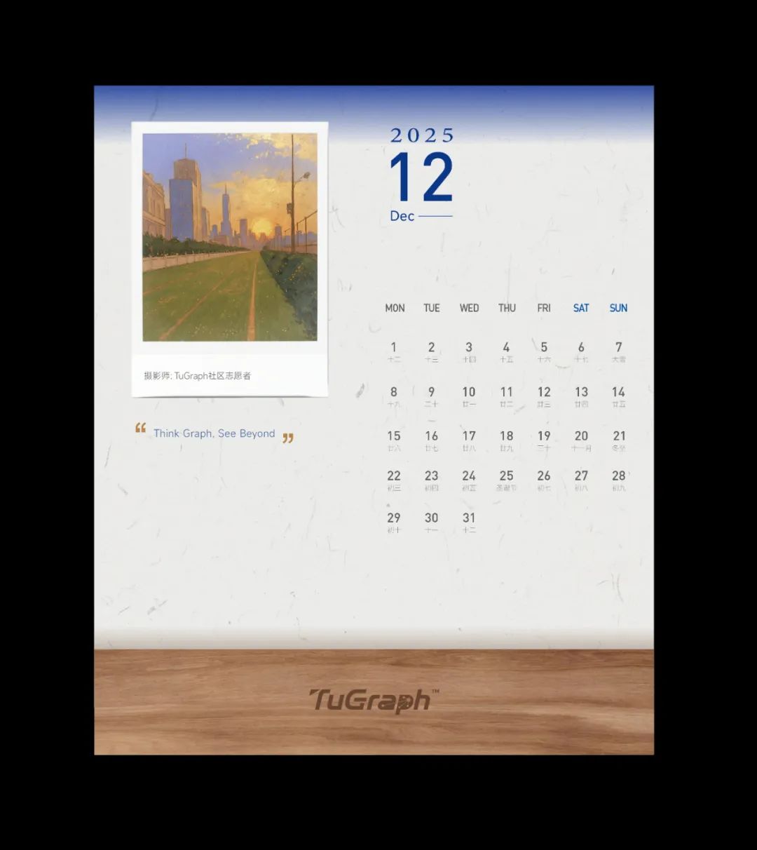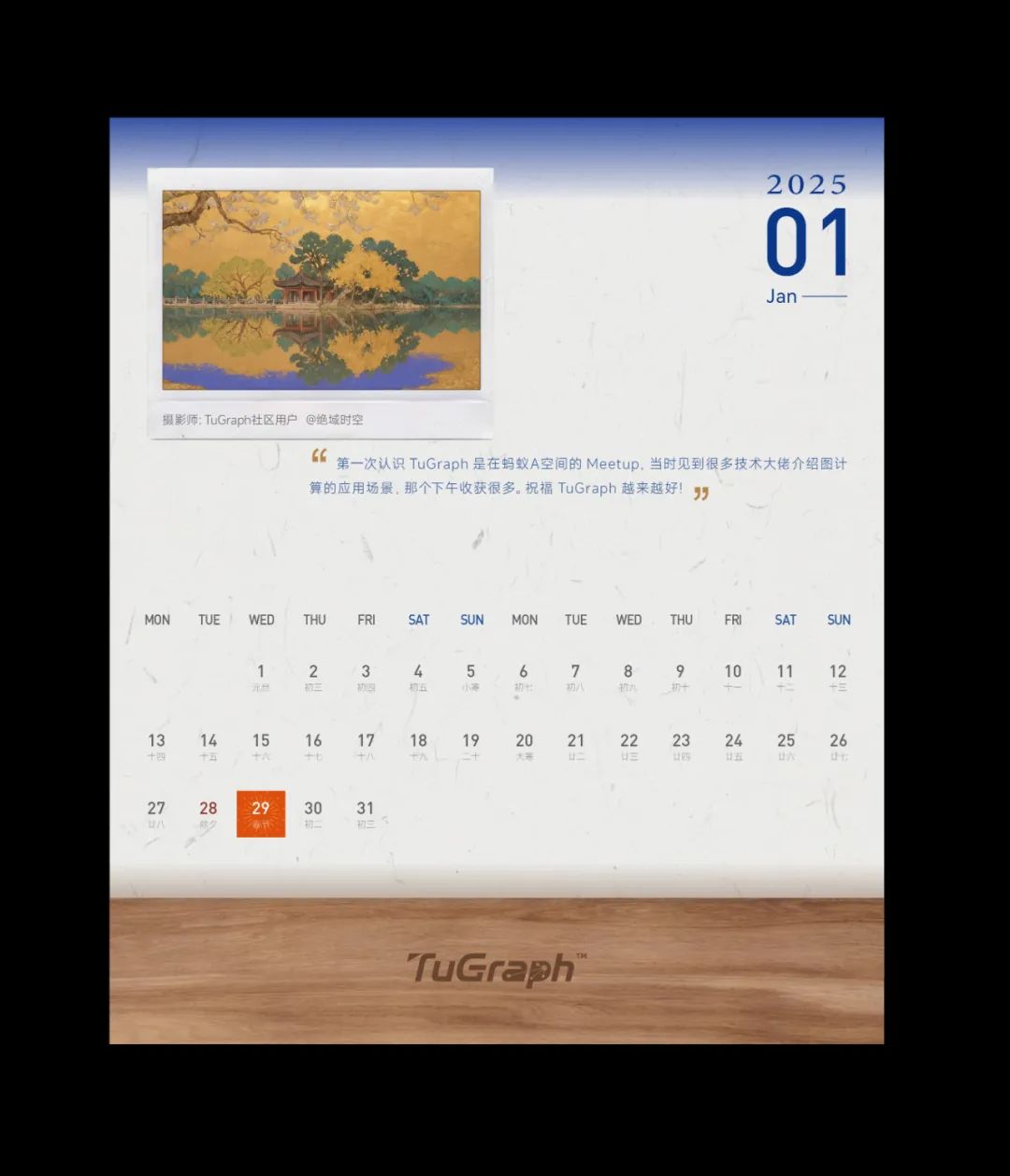 我们将每位投稿人分享的内容和自己拍摄的照片作为主体,制作了 TuGraph 2025 台历。借着台历新鲜出炉,也让我们一起来看看社区成员眼中的“TuGraph 2024”吧!