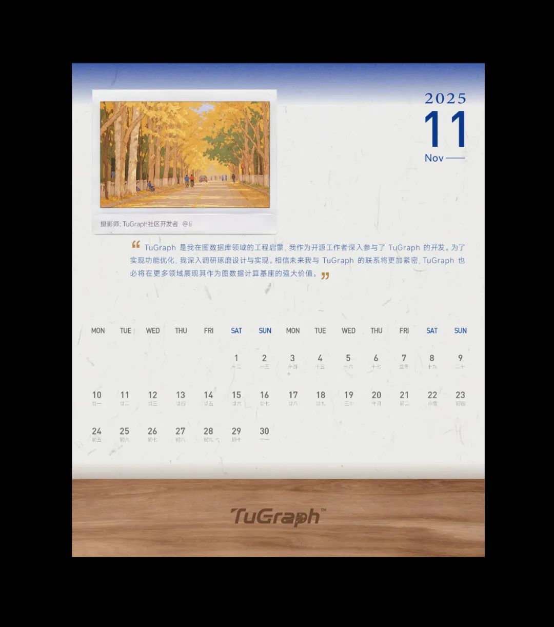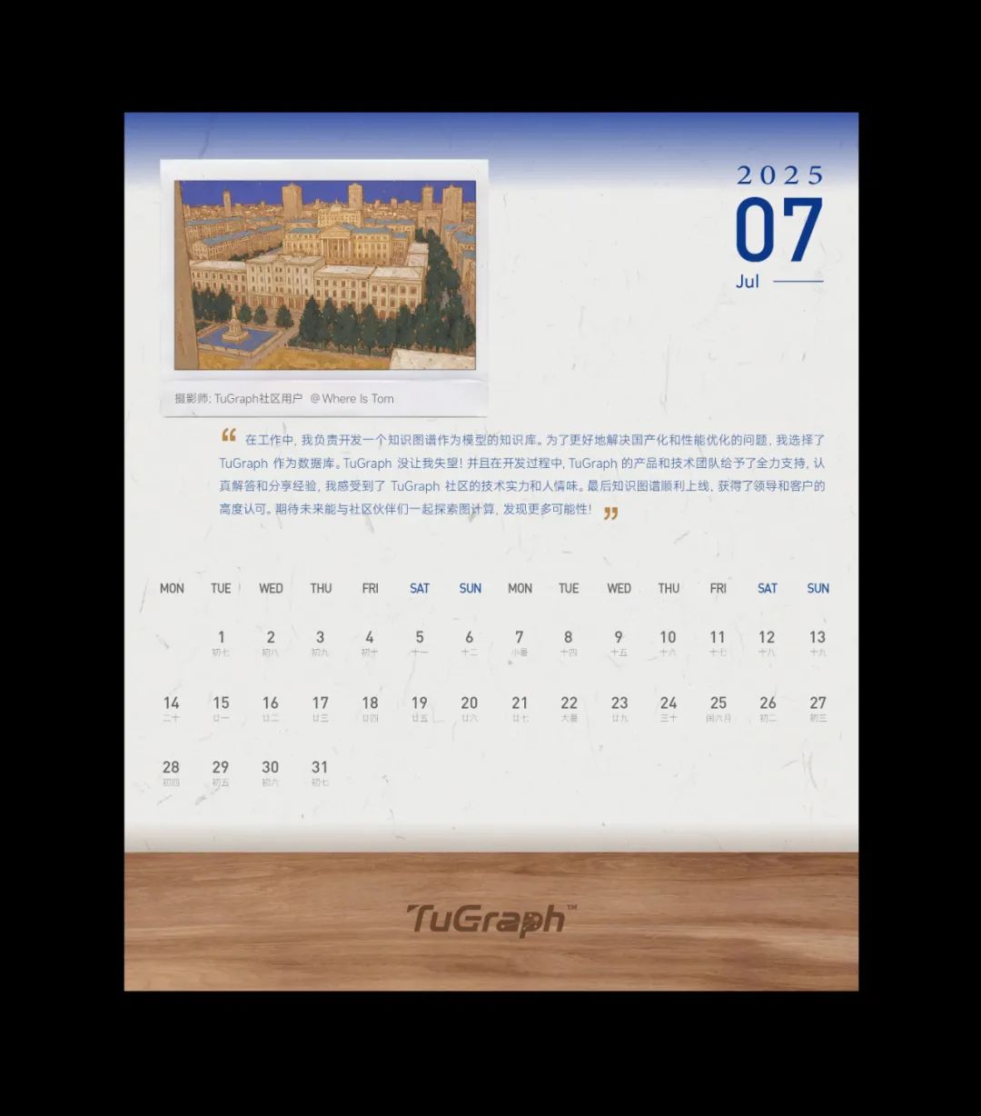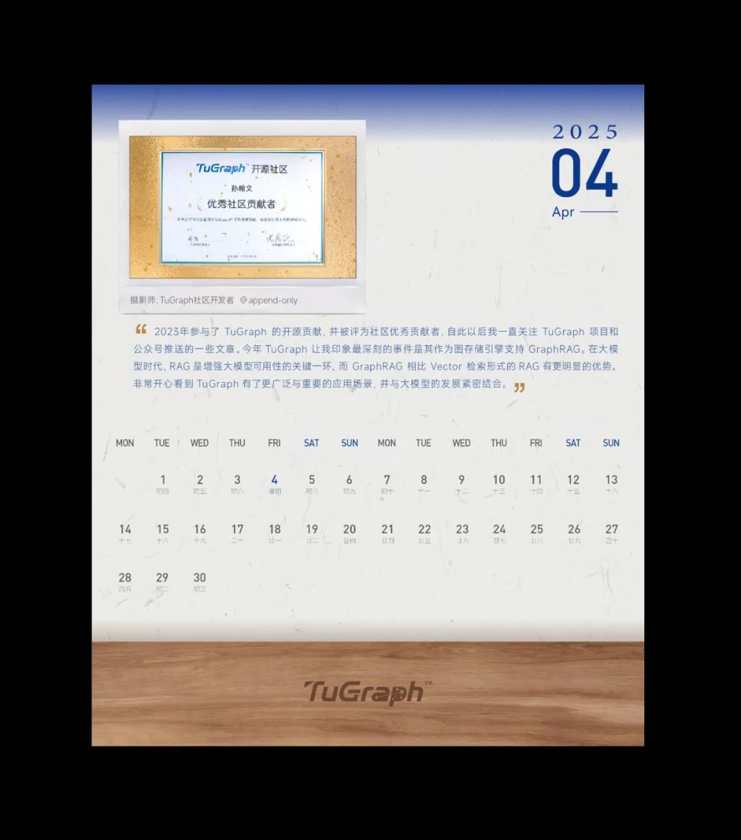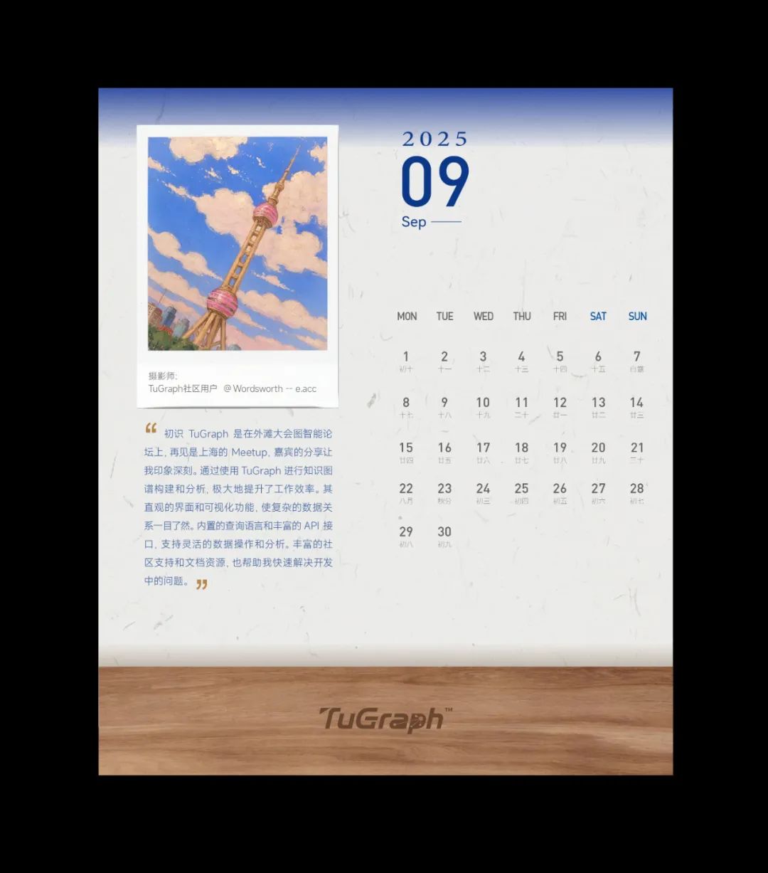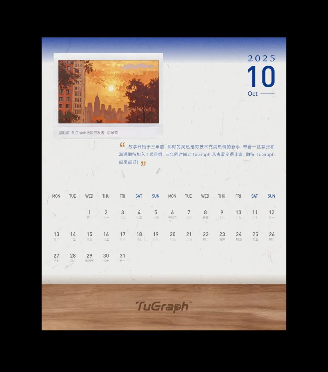 我们将每位投稿人分享的内容和自己拍摄的照片作为主体,制作了 TuGraph 2025 台历。借着台历新鲜出炉,也让我们一起来看看社区成员眼中的“TuGraph 2024”吧!