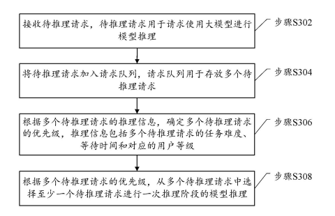 所述根据所述多个推理请求的推理信息,确定所述多个推 理请求的优先级,包括: 对于每个所述推理请求,执行以下操作: 根据所述推理请求的任务难度,确定第一优先级; 根据所述推理请求的等待时间和第一参数,确定第二优先级; 根据所述推理请求对应的用户等级和第二参数,确定第三优先级; 根据所述第一优先级、所述第二优先级和所述第三优先级,确定所述推理请求的优先 级。