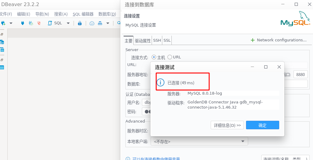 弹出 连接测试 窗口,显示已连接表示配置无误,如果出现 连接错误 窗口,请检查输入参数。