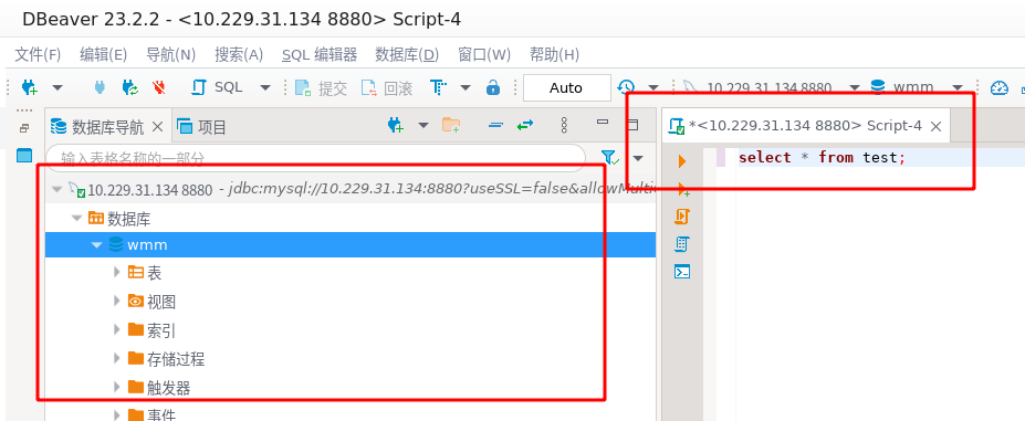 参数 描述 url 连接字符串,采用标准 JDBC 连接串写法。 pass 数据库密码。 username 数据库用户名。 sql 需要执行的 SQL。